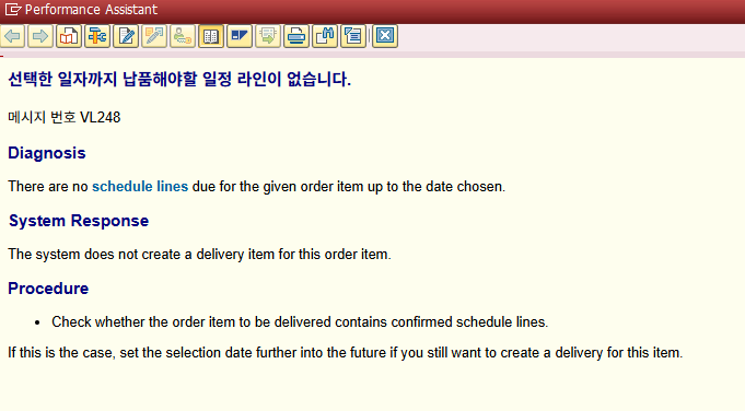 SAP VL248 오류는 VL01N이나 VL10에서 납품문서를 생성할 때, 시스템이 납품할 수 있는 일정 라인을 찾지 못할 경우 발생합니다. 즉, 납품 가능한 날짜와 수량이 시스템에 존재하지 않는 것으로 인식되기 때문에 에러가 발생하는 것입니다.