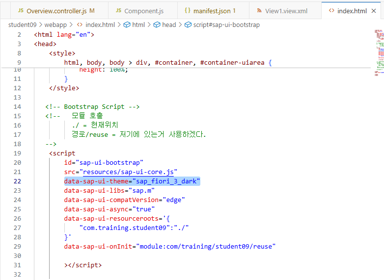 SAPUI5 테마는 bootstrap 스크립트에서 data-sap-ui-theme 속성으로 지정합니다.