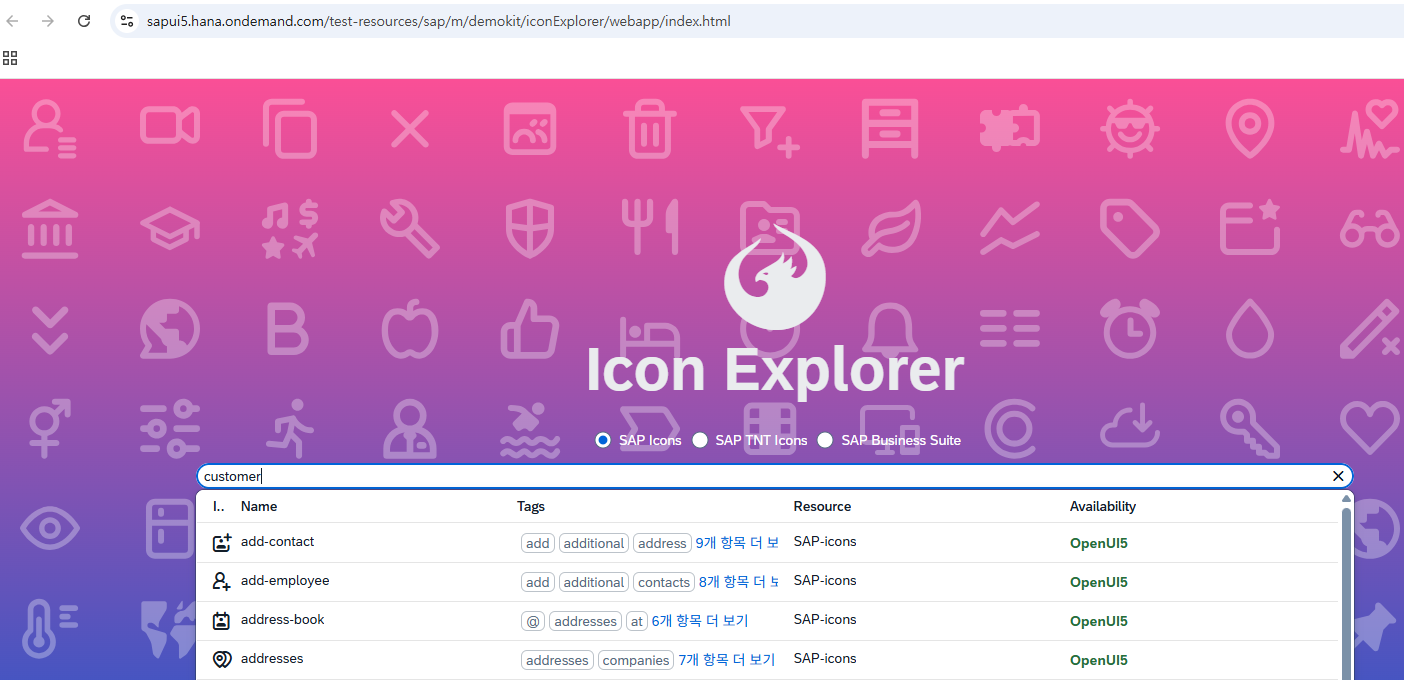 UI5 Demo kit 사이트 밑에 Icon Explorer 클릭하면 ICON 을 쉽게 찾고 ID 를 알 수 있다.