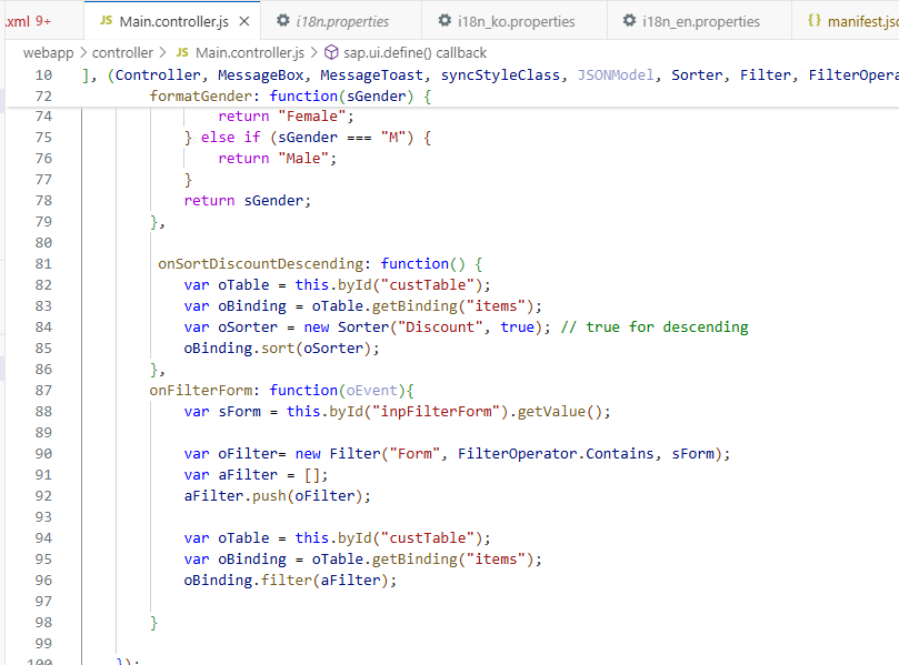 - getBinding("items"): List/Table에 바인딩된 데이터를 가져와 조작 가능