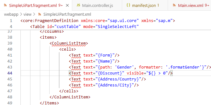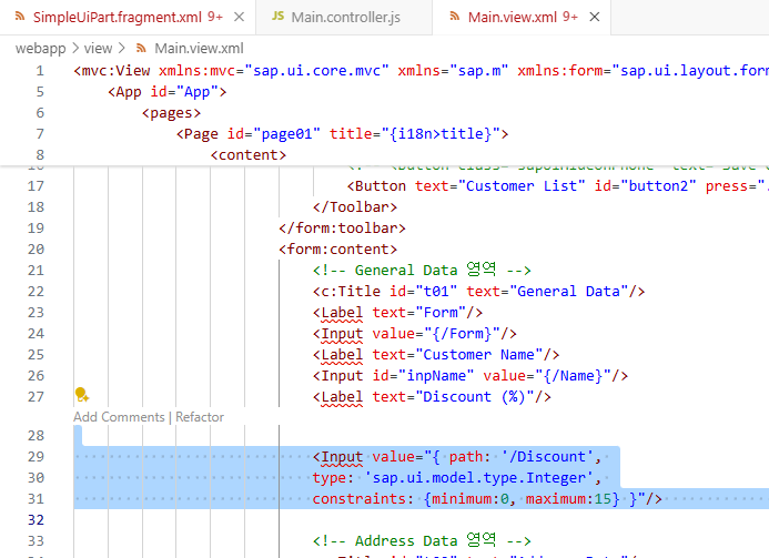 먼저, 다음은 XML View에서 sap.ui.model.type.Integer를 사용해 Discount 항목에 숫자 타입을 지정한 예제입니다.