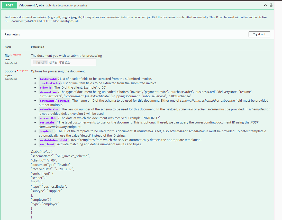 - 실제로 POST /document/jobs를 선택하면,