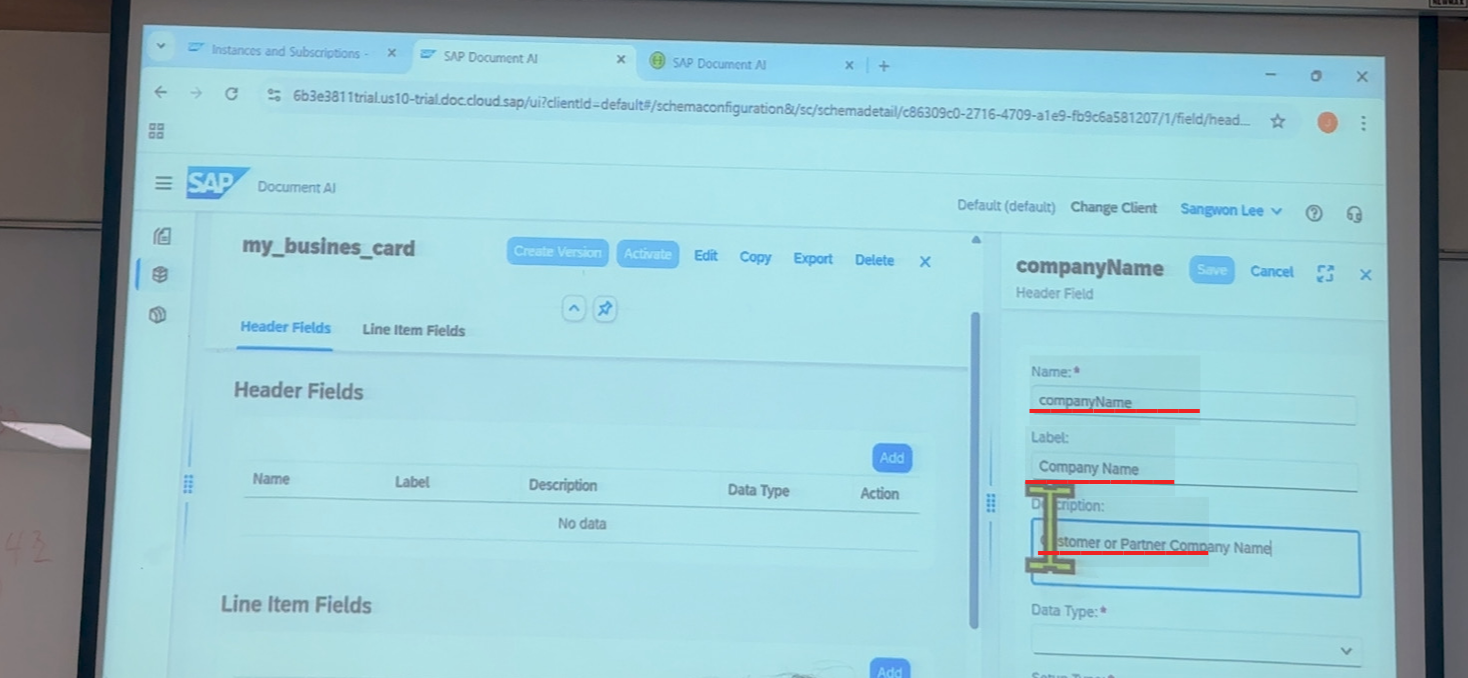 처음에 사용자가 문서를 업로드하면, SAP Document AI가 자동으로 문서를 분석해서 필요한 필드(예: 금액, 날짜, 수신자 등)를 추출한다.