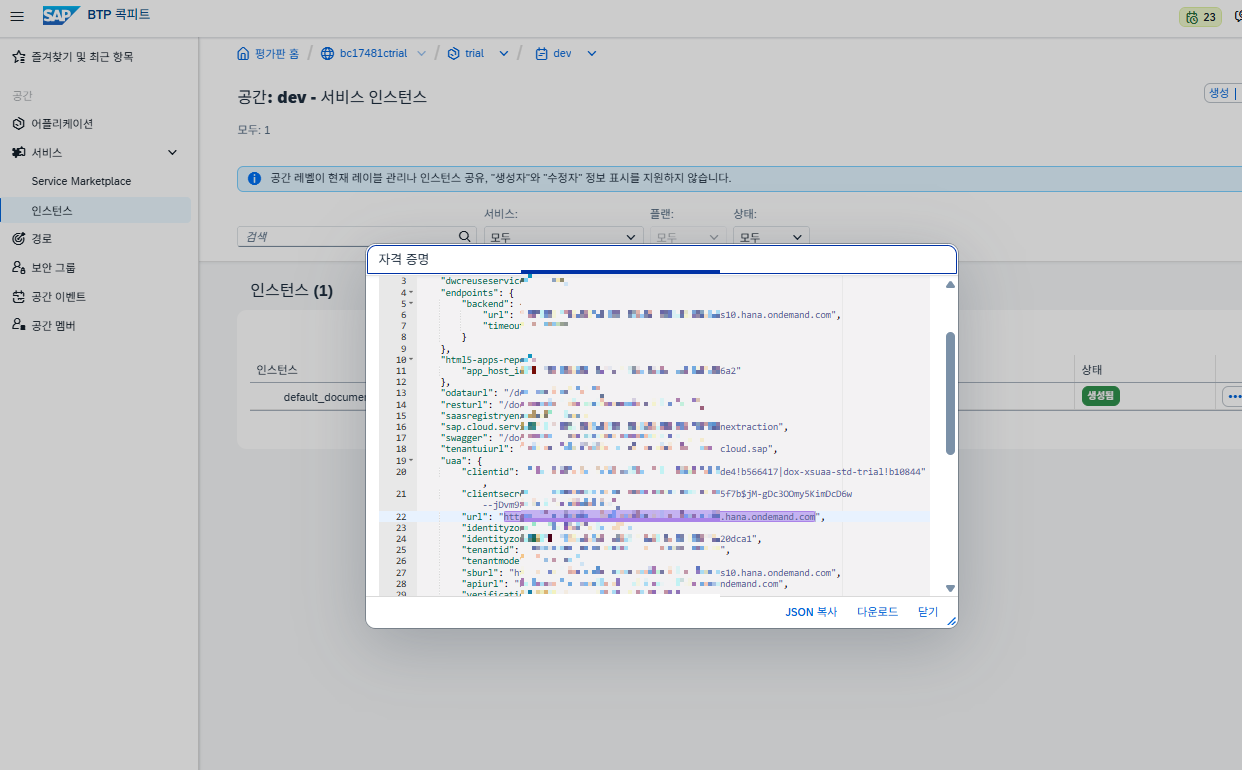 - SAP BTP Cockpit에서 Document AI 서비스를 서비스 인스턴스로 생성