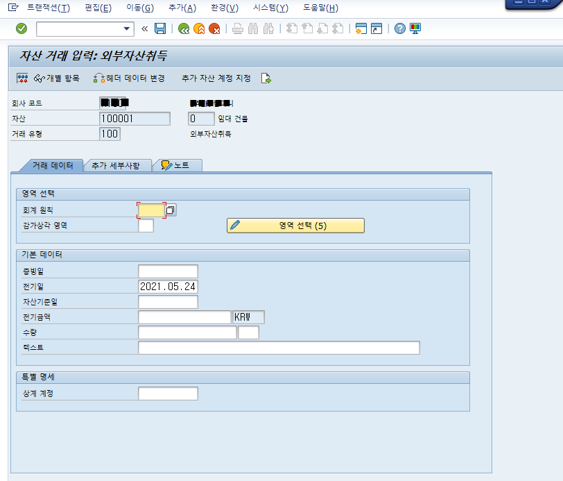 4. T-code : AB01 에서 자산 취득 (올해 취득 금액 / 거래유형 100)