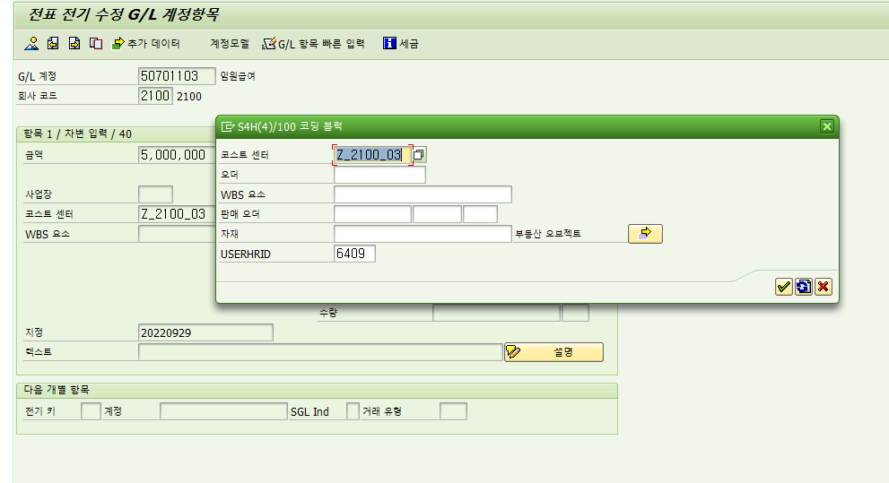 6단계 : 해당 Posting key로 전표생성시 뚫려있는 필드에 값 넣습니다.