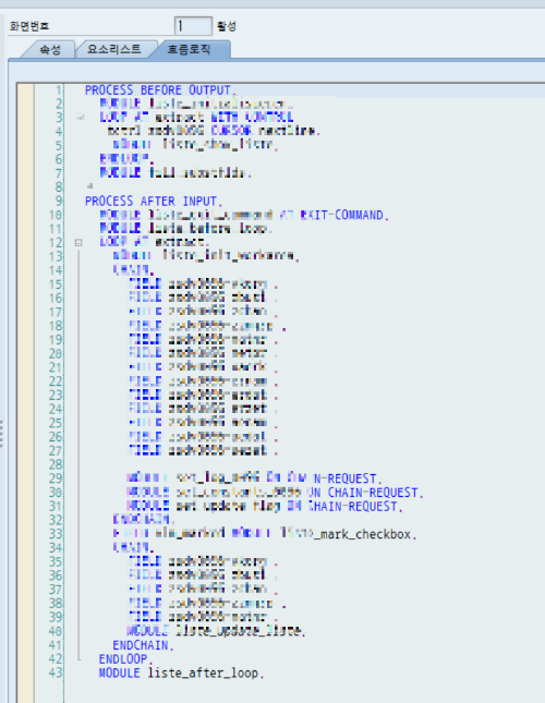 모듈풀의 화면 혹은 VIEW 화면 의 경우 흐름로직 (Flow Logic) 을 통해 화면을 구성해야한다.